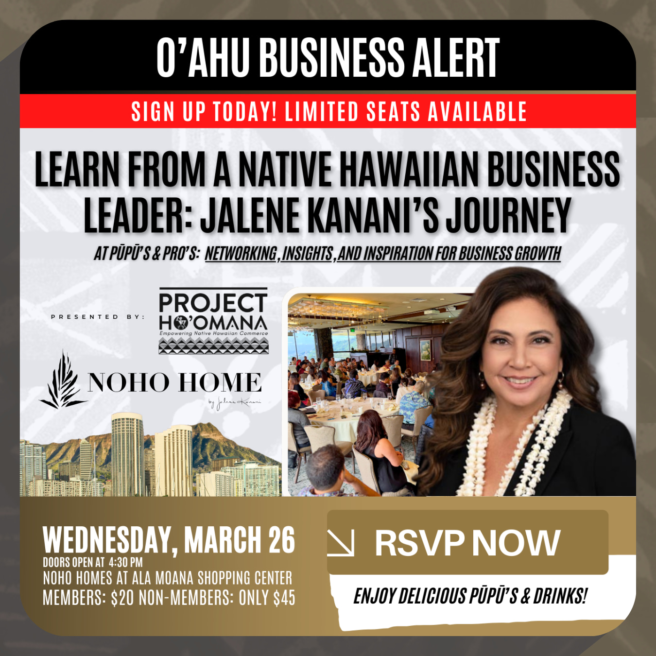 At this exclusive event, Jalene will share insights into her entrepreneurial path, the challenges of scaling a business, and the importance of cultural identity in branding. Whether you’re an aspiring entrepreneur, an established business leader, or someone passionate about Native Hawaiian culture, this is an opportunity to gain valuable knowledge, inspiration, and connections.