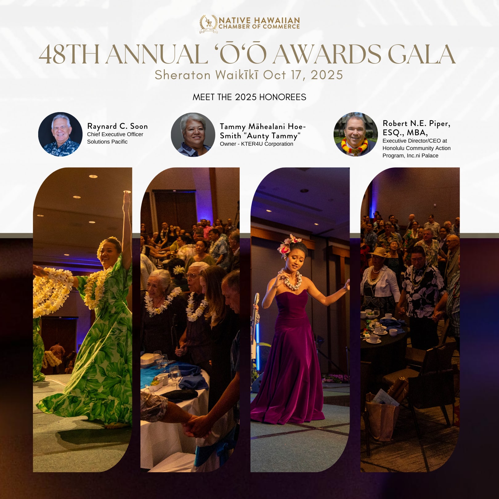 The Native Hawaiian Chamber of Commerce is a dedicated non-profit organization that offers invaluable programs for the Native Hawaiian business community and provides scholarship funds for Native Hawaiian students pursuing degrees in business. As part of our ongoing fundraising efforts, NHCC proudly hosts the annual ‘Ō‘ō Awards Gala. This elegant event is a celebration of excellence, honoring distinguished Native Hawaiians who have made significant contributions to the advancement and vibrancy of the Hawaiian community.