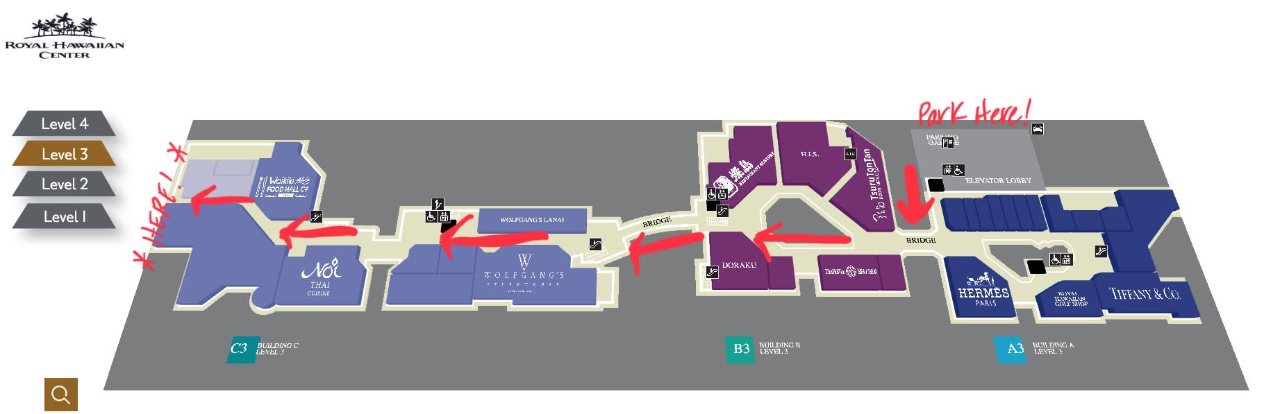 Park in the Royal Hawaiian Center parking lot and bring your parking ticket with you for a full validation! The parking lot is in Building A. To get to the party, simply walk over to Building C and weʻll be on the 3rd Floor on the Diamond Head end just past Noi Thai Cuisine and the Waikīkī Food Hall.